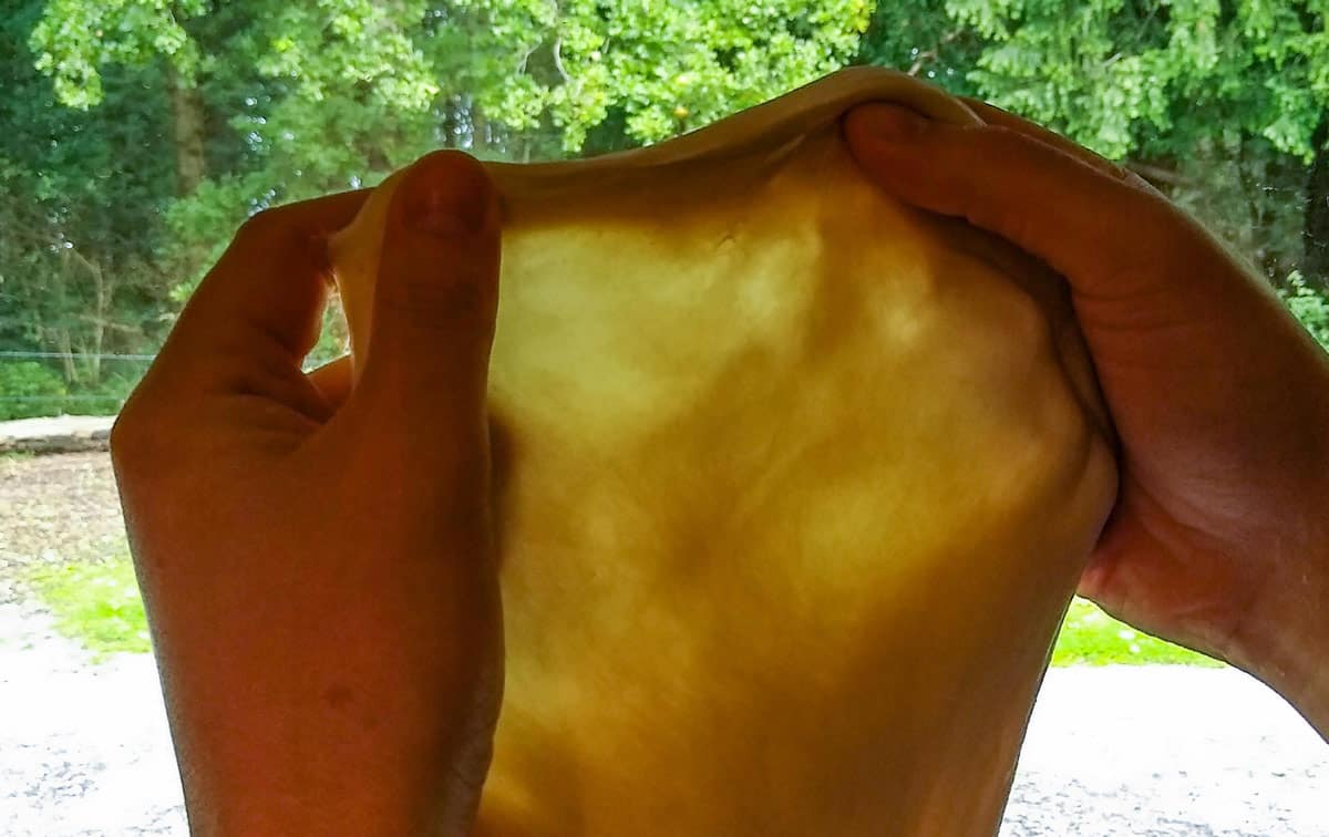 With practice you will be able to stretch it so thin that you can see the gluten network. To start with, it’s easier to use a small piece of dough about golf ball size.