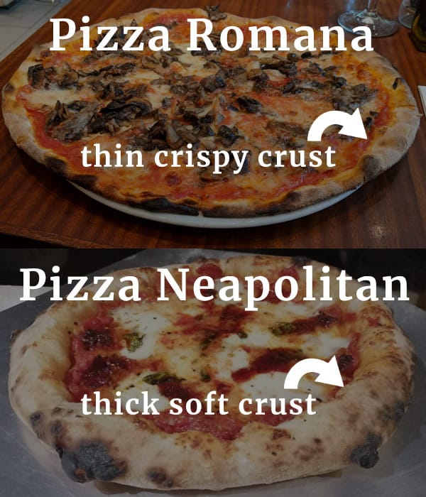 Both Neapolitan style pizza and Roman style pizza are renowned for their excellence. A Romana pizza appeals to those like a really crispy thin crust and a Neapolitan pizza appeals to those that like a thicker crust that is soft in the middle but still crispy on the outside.